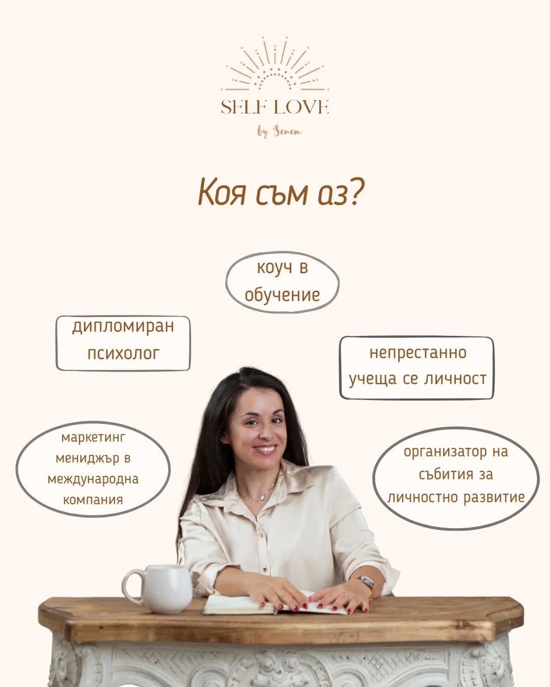 Днес работя със себелюбовта като посока и с коучинга като инструмент. Завърших магистратура по психология и диплома по лайф коучинг в Noble Manhattan. Паралелно преживях собствената си промяна — от хаотична заетост и компромисни отношения до стабилен дом, работа, която резонира, и връзка, която не компрометира.